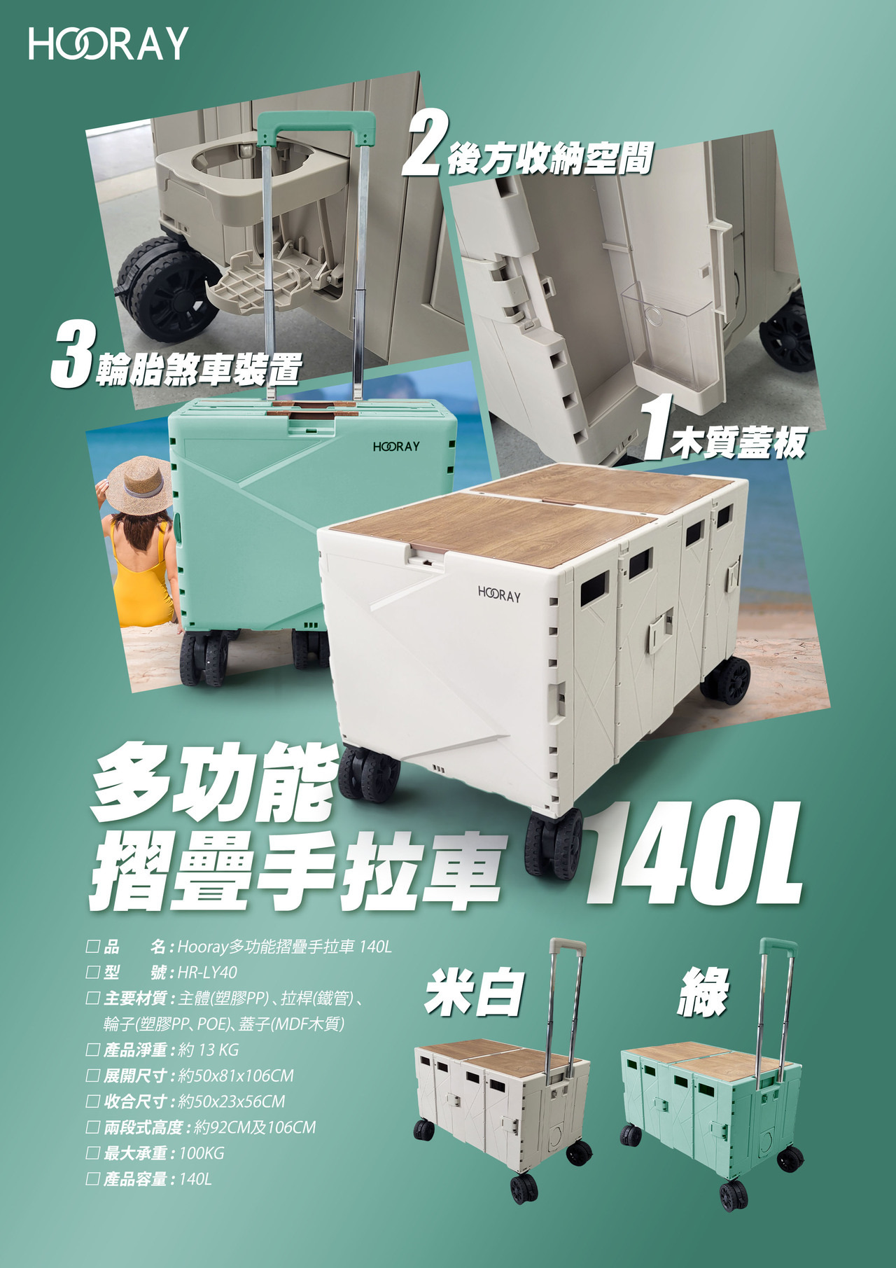 型號:HR-LY40 主要材質:主體(塑膠 PP)、拉桿(鐵管)、輪子(塑膠 PP、POE)、蓋子(MDF 木質) 產品淨重:約 13 KG 展開尺寸:約 50 × 81 × 106 CM 收合尺寸:約 50 × 23 × 56 CM 兩段式高度:約 92 CM 及 106 CM 最大承重:100 KG 產品容量:140 L